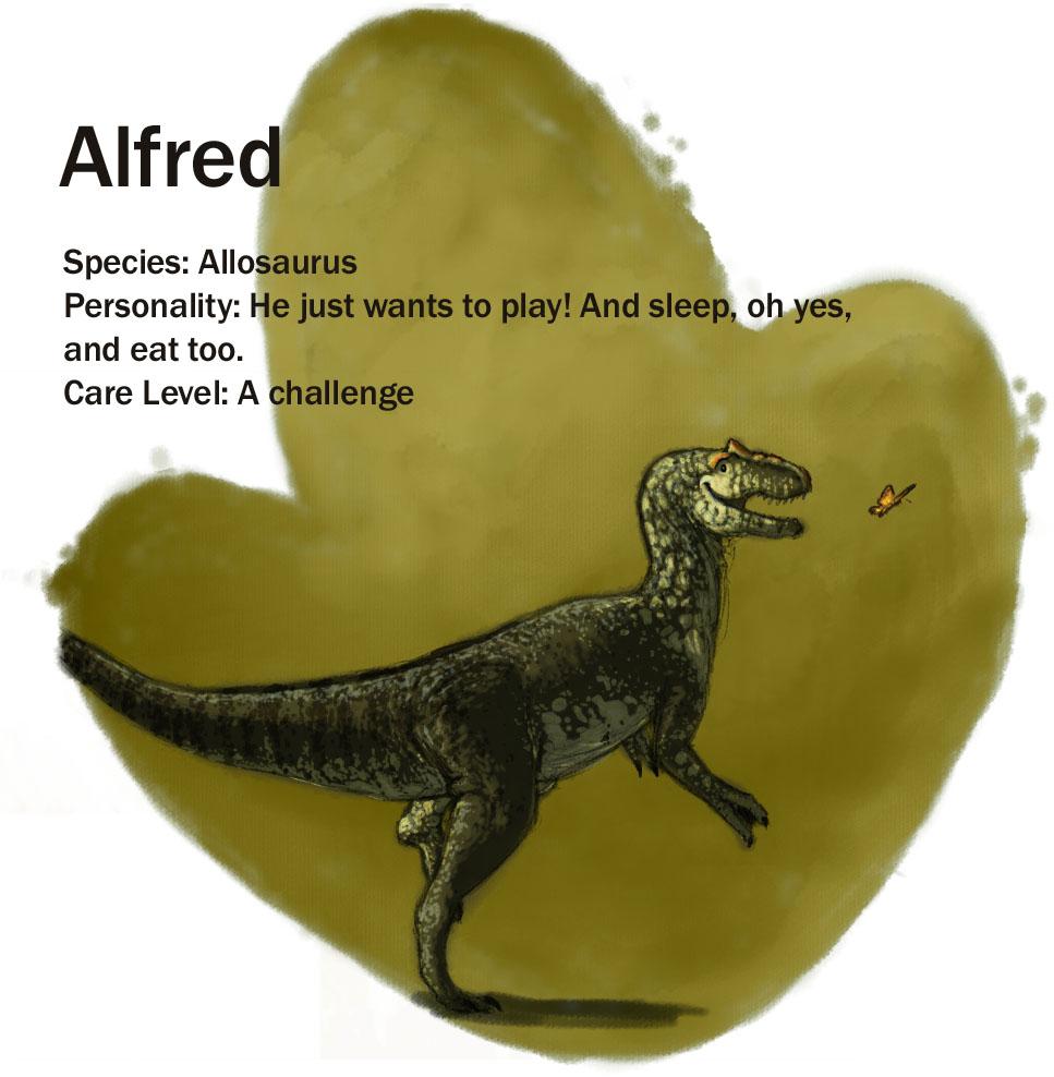 Alfred June 14, 2016February 22, 2017 | Patricia Bujard Alfred Species: Allosaurus domesticus Wild cousin: Allosaurus Share this:TweetLike Loading...