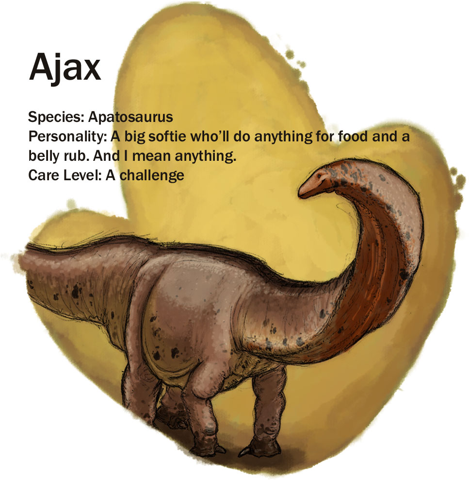 ajax update August 29, 2016February 22, 2017 | Patricia Bujard Ajax Species: Apatosaurus domesticus Wild cousin: Apatosaurus Ajax Share this:TweetLike Loading...