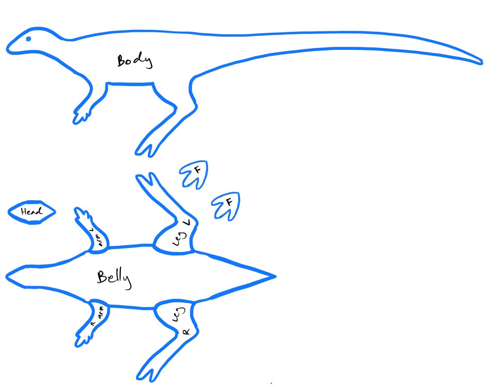 I used Scott Hartman’s skeletal of Scutellosaurus as the outline for my first design, and simplified it as I went to be more friendly for sewing. Then I studied several of my kid’s stuffed animals to understand how the pieces would fit. Older Beanie babies have a nice, simple design, so as a beginner I found a Beanie kangaroo particularly helpful. 🙂