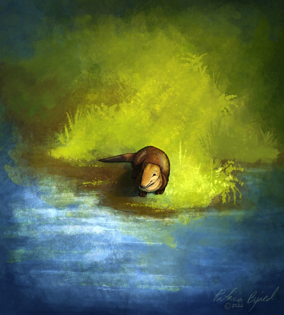 Other details in Castorocauda’s appearance or possible behavior may be more like a platypus. It lived in a murky river environment surrounded by dense forest, it had a spur on its hind feet like a platypus, and probably walked on land in a very similar way. Imagine a slightly longer, more pointed snout on the otter below, and it is easy to imagine Castorocauda diving to the river’s murky bottom hunting for crayfish or fish among the rotting fronds of ferns or fallen ginkgo leaves.