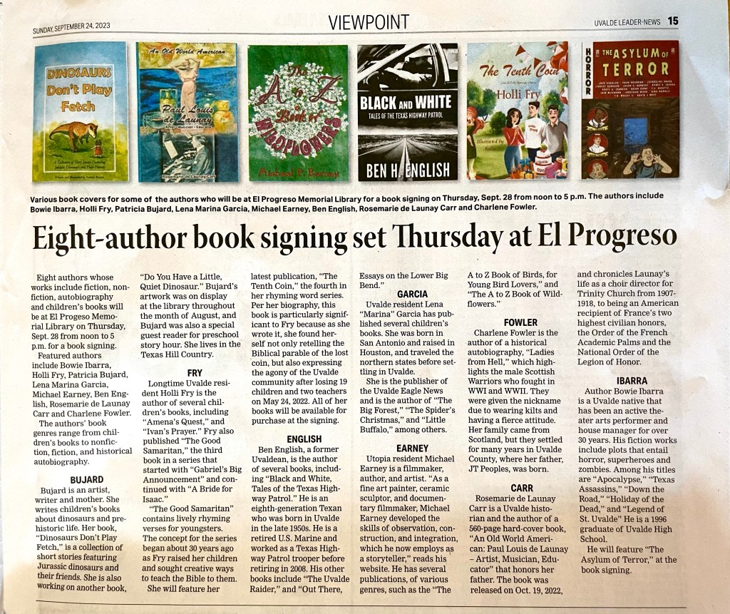 Mr. Mendell Morgan, the local library director here in Uvalde, is fast becoming a good friend of mine. He is a very generous person who loves supporting local talent, and I always love an opportunity to visit with the kids for Wednesday story time or one of the many interesting events they host there.