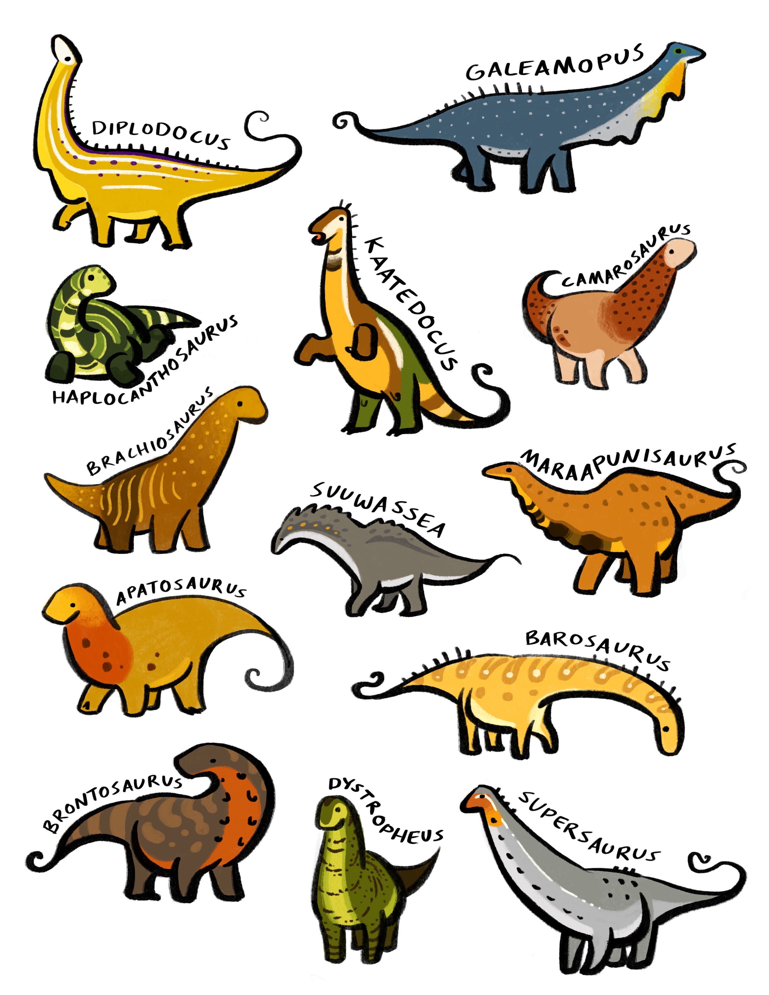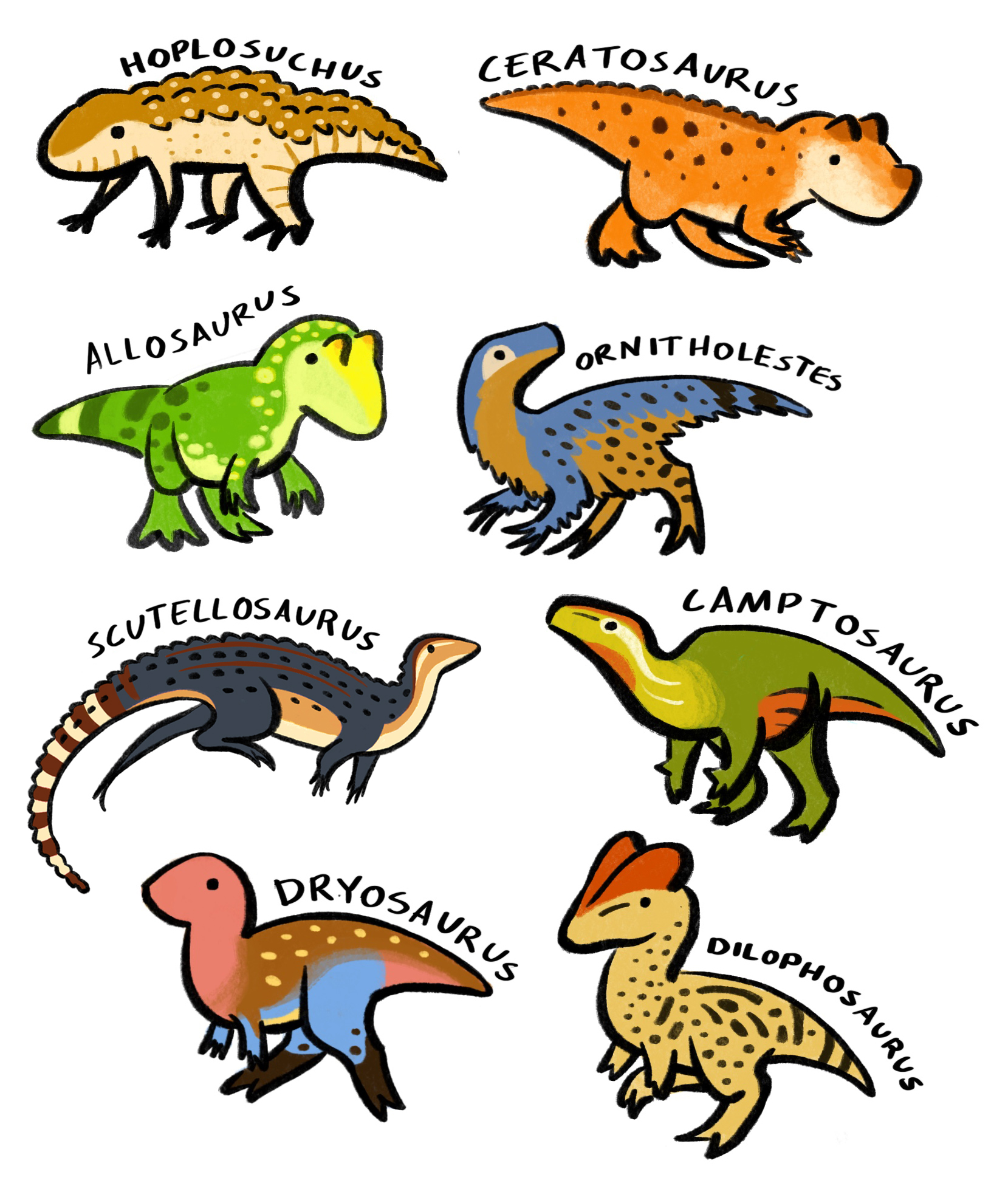 Dilophosaurus and Scutellosaurus later got updates for their chibi-style stickers, but all of the others down below are from the Morrison Formation in the Western US. There are a lot of famous dinosaurs from the Late Jurassic here, so you can find several of them as part of the paleo pals over at the shop, like Rosie the Dryosaurus, Bowser the Ceratosaurus, and Bella the Camarasaurus.