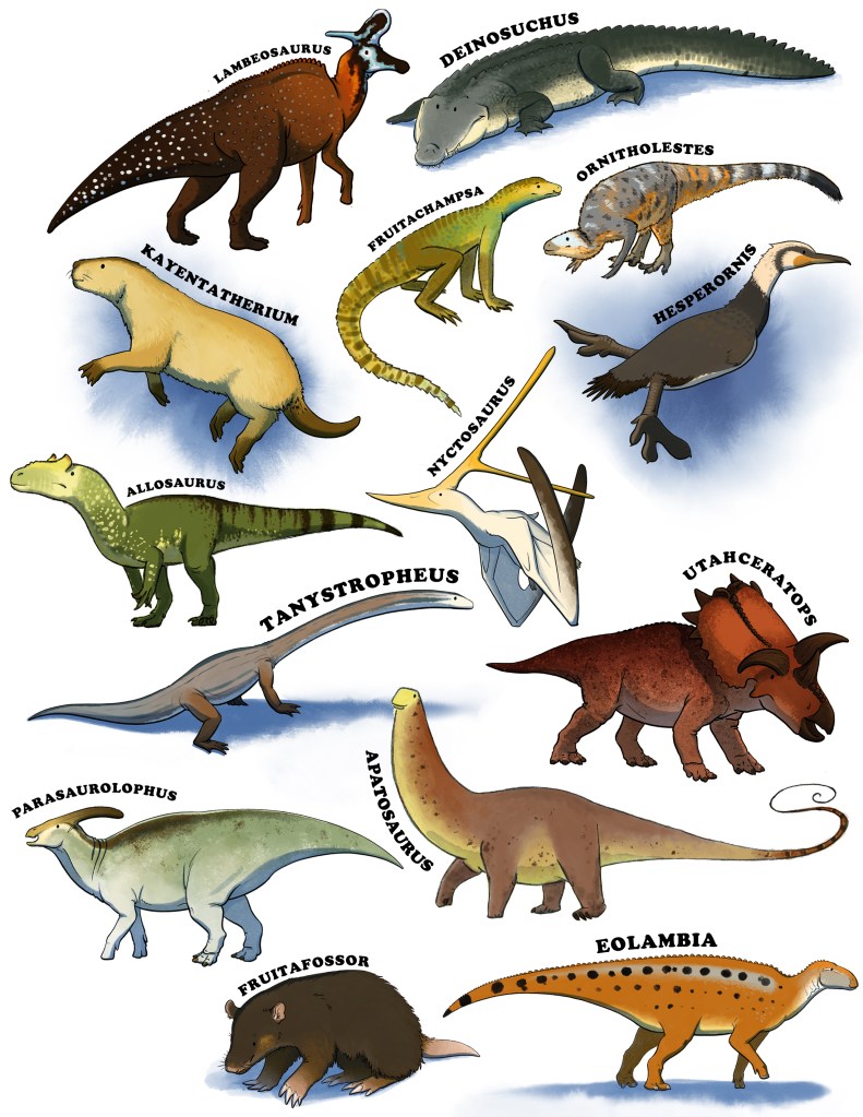 To celebrate, let’s take a look at all the dinosaurs and other critters I’ve drawn and see which ones are from the USA. The first set are all from the Kayenta Formation in New Mexico. Skittles the Scutellosaurus and Picasso the Dilophosaurus are from there, and lived during the Early Jurassic Period.
