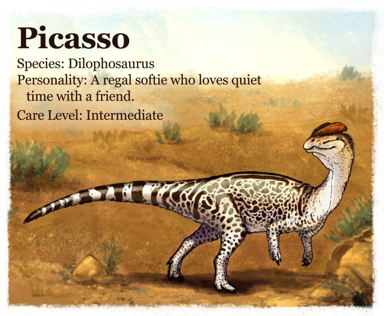 On the subject of fancy feathers and their many uses, here is Picasso the Dilophosaurus, from Early Jurassic North America!