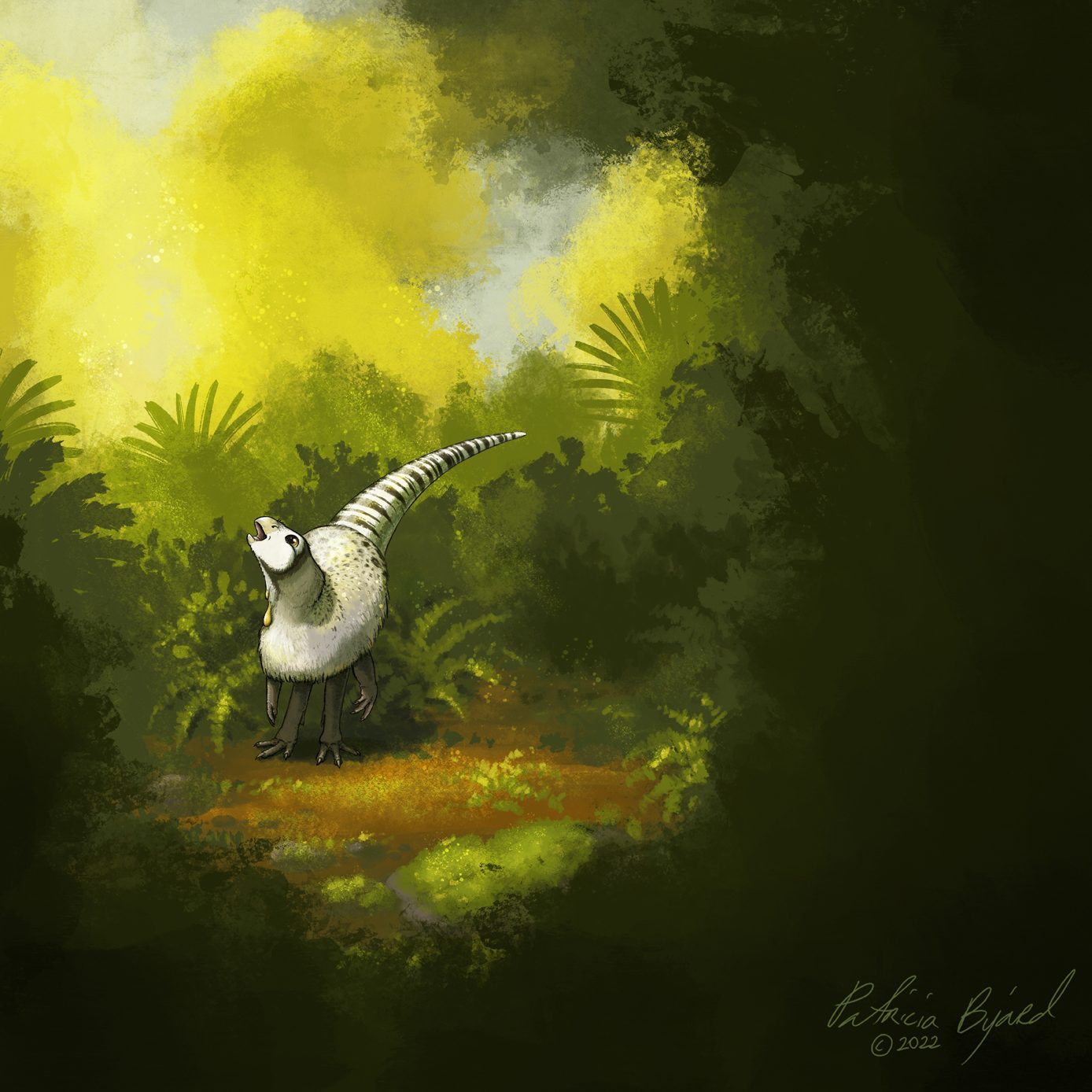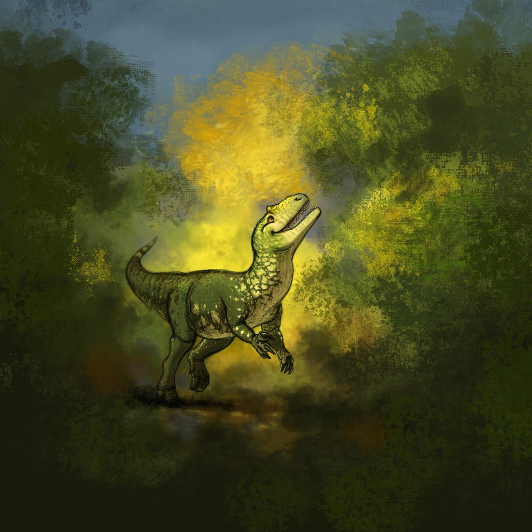 A Nanosaurus is pleased to find a sunny clearing in the dark forest.