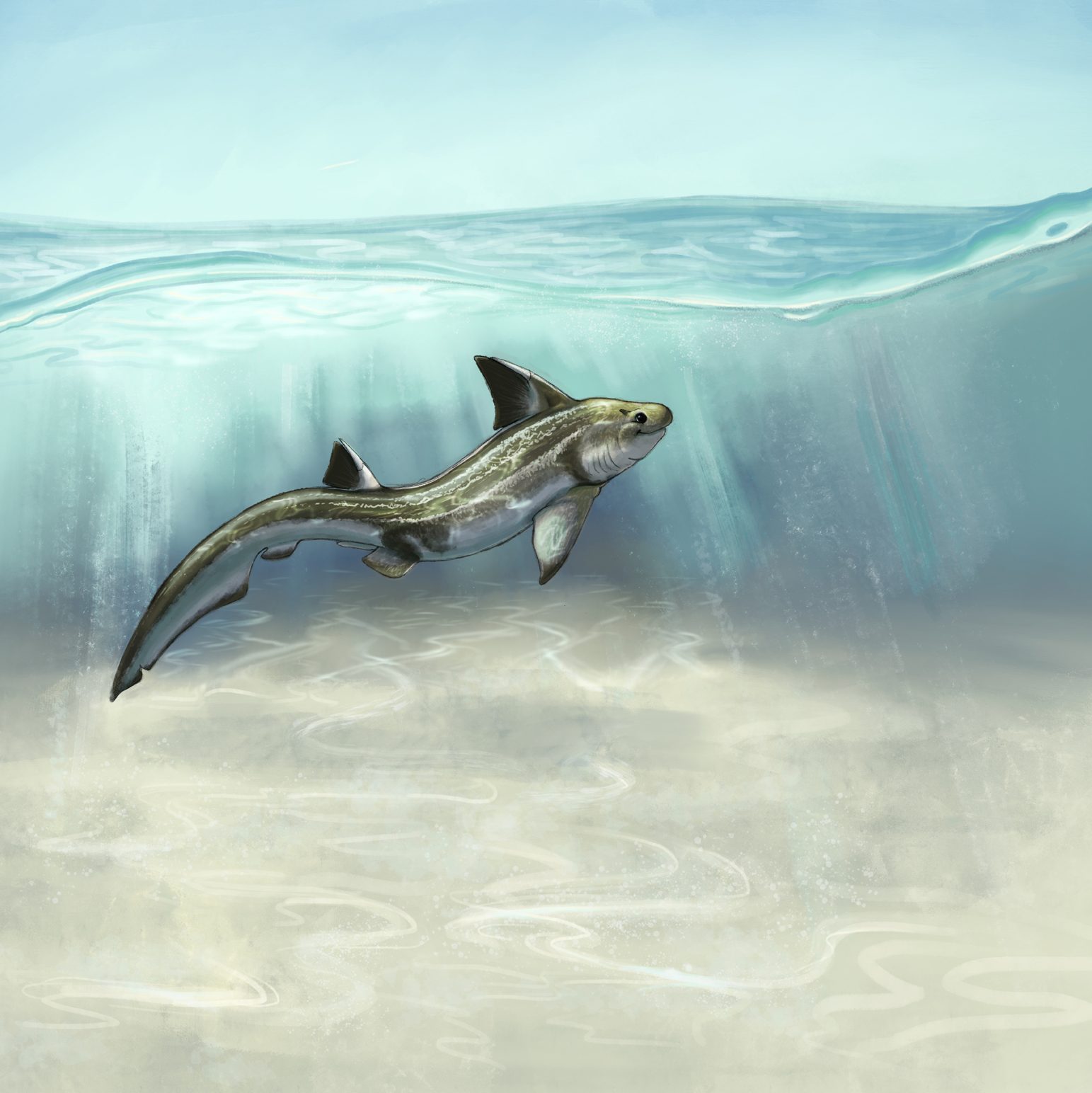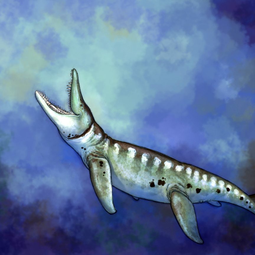 An Ichthyosaurus cruises the sunlit ocean surrounding Jurassic England.