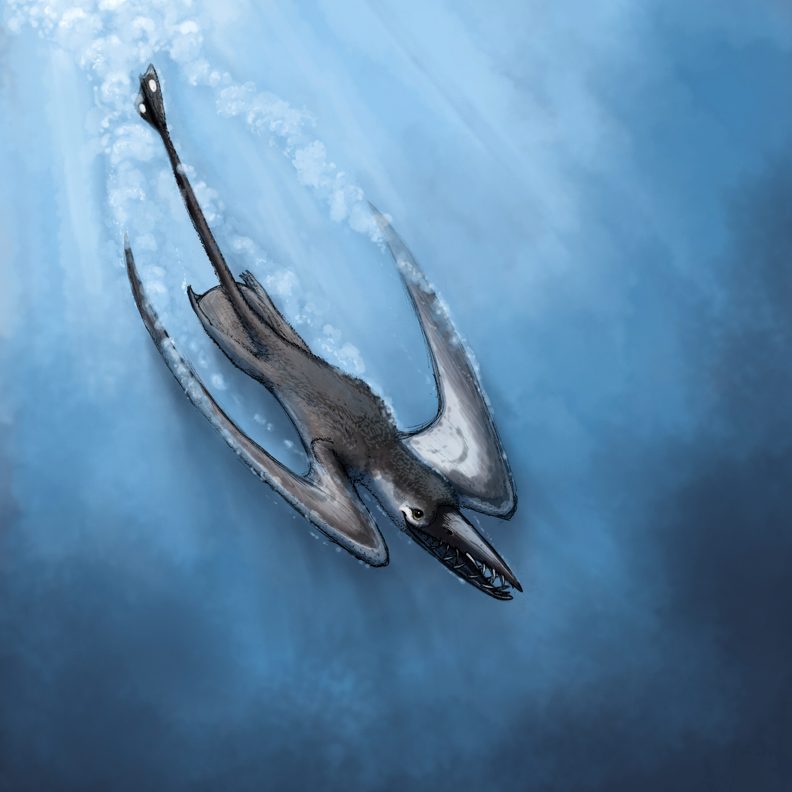 A happy Dimorphodon chases after something small and unseen in the undergrowth.