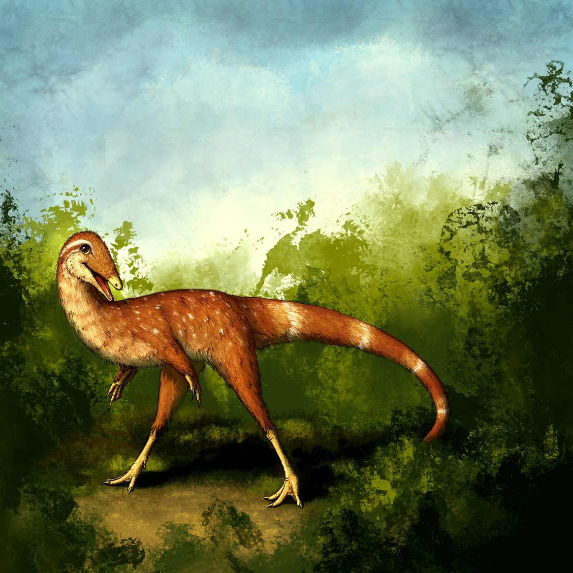 A fluffy Ornitholestes dances in the warm light of sunset.